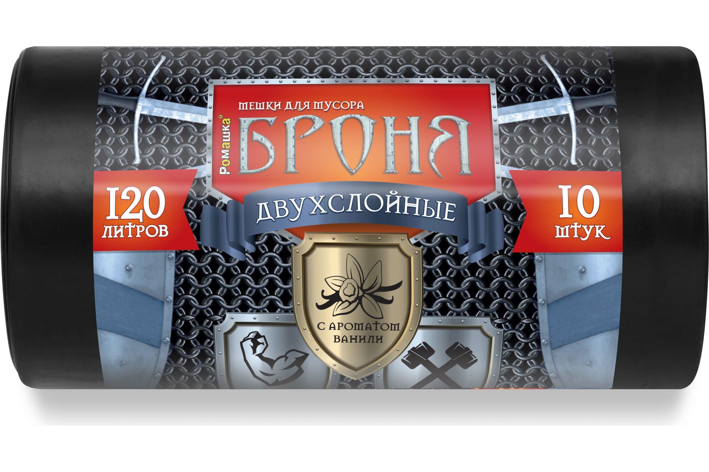 Мешки для мусора в рулоне Броня (120 л; 10 шт, черные, ПВД, 60 мкм, 2-х слойные, 70x110 см) Ромашка ВР-0010