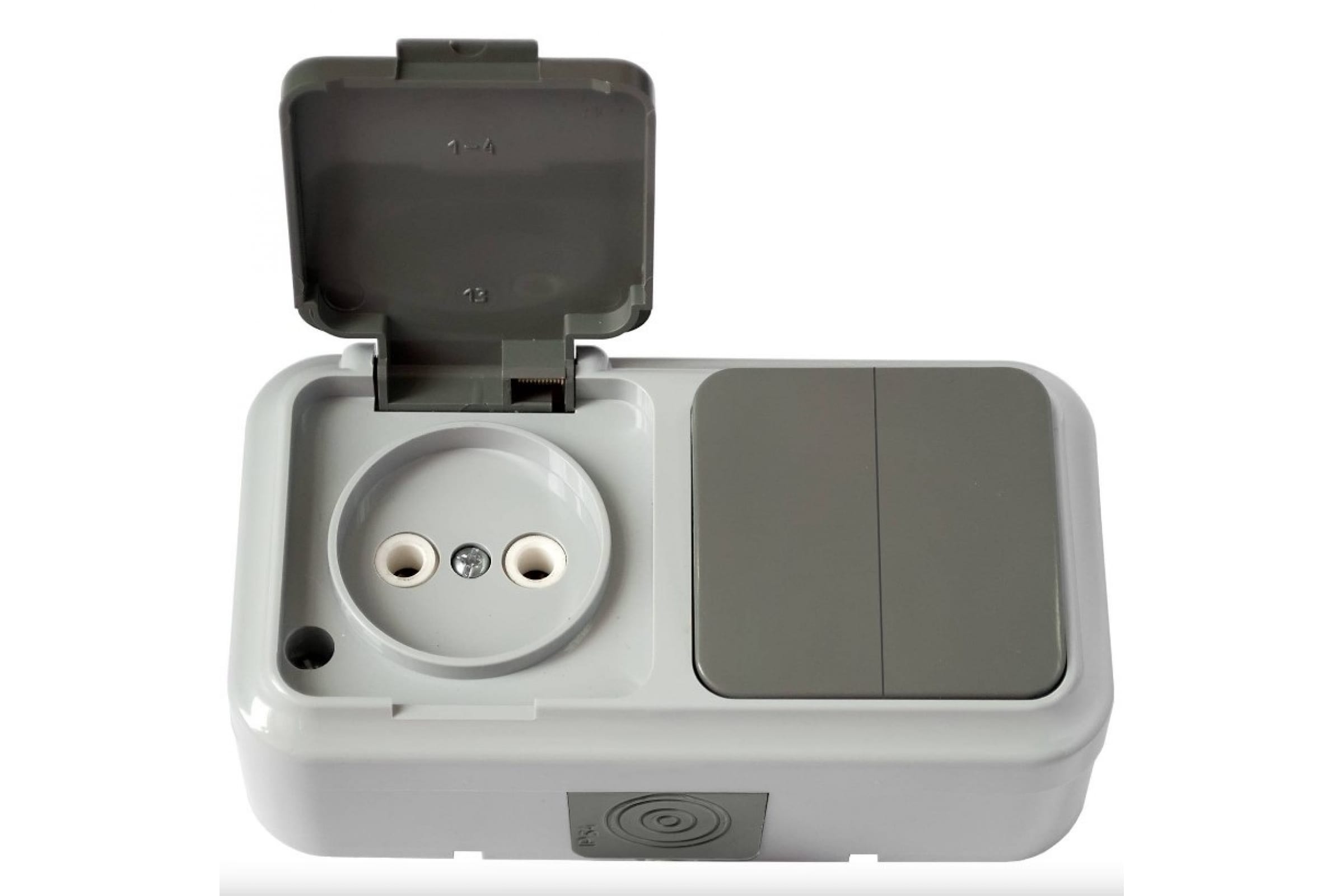 Блок Bylectrica 2 выключателя + розетка ОУ IP54, серия ПРАЛЕСКА АКВА, серый, 2В-РЦ-655 03