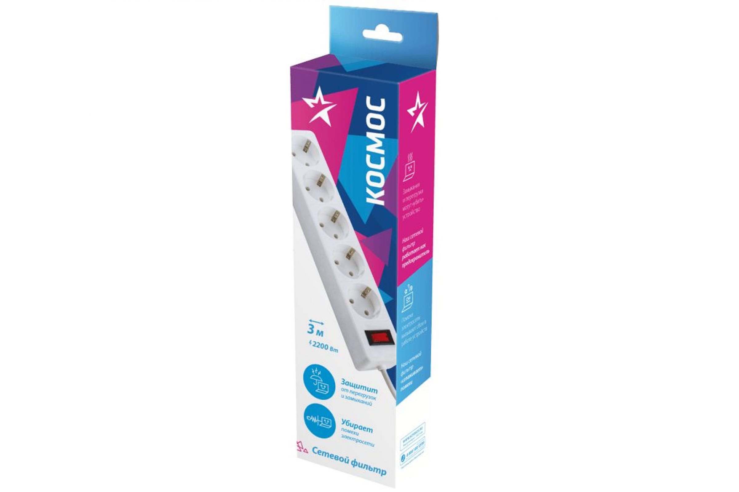 Удлинитель с сетевым фильтром КОСМОС 5х3м с заземл. 10А IP20 2.2кВт 3х0.75 FKsm3m-5gW 472203