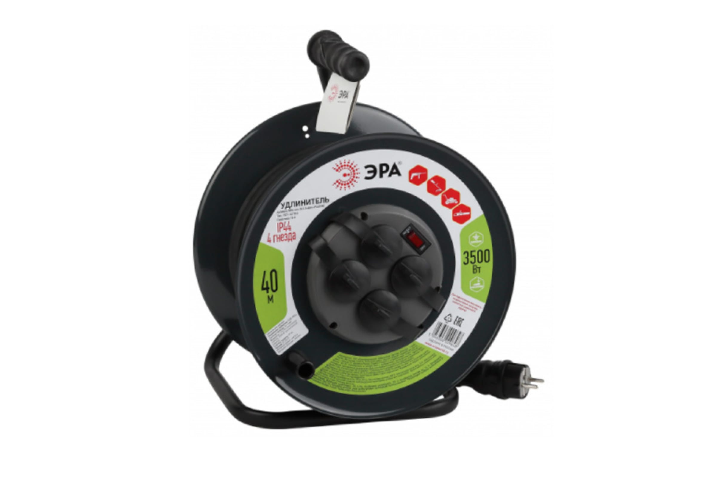 Силовой удлинитель ЭРА RMx-4es-3x1.5-40m-IP44-KG на металлической катушке, с заземлением, 4 гнезда, 40 м Б0046848