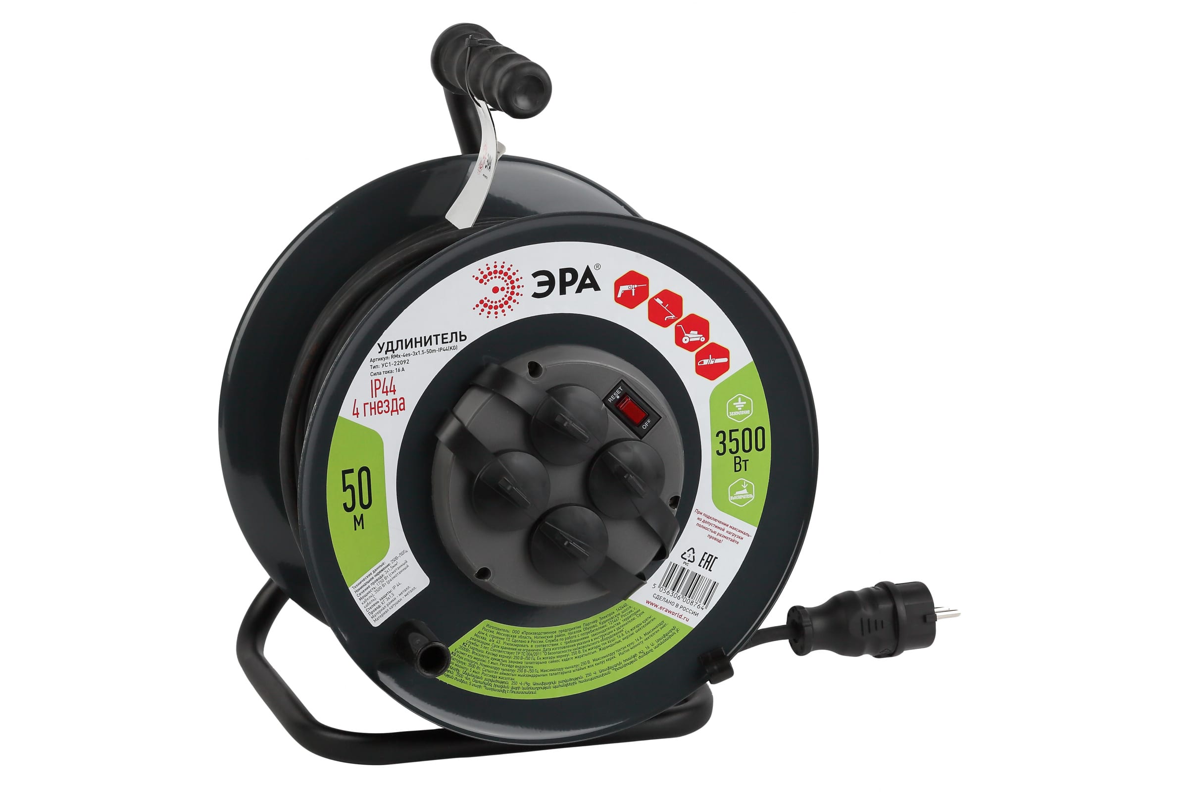 Силовой удлинитель ЭРА RMx4es3x1.5 50m IP44 KG на катушке c заземлением 4 гнезда 5 Б0046804