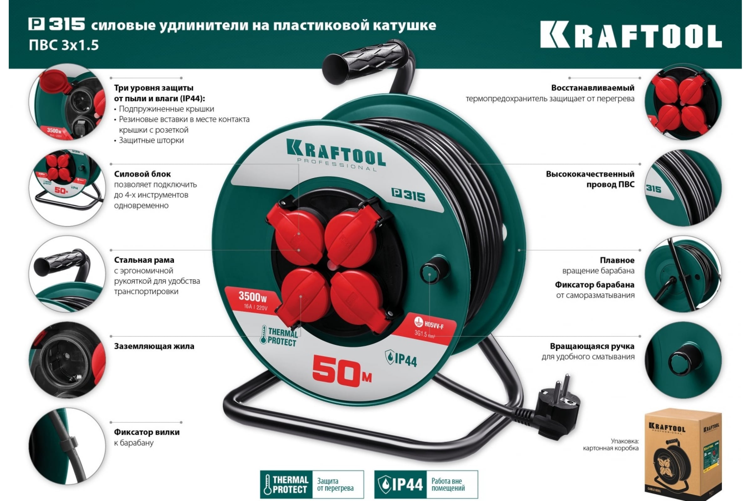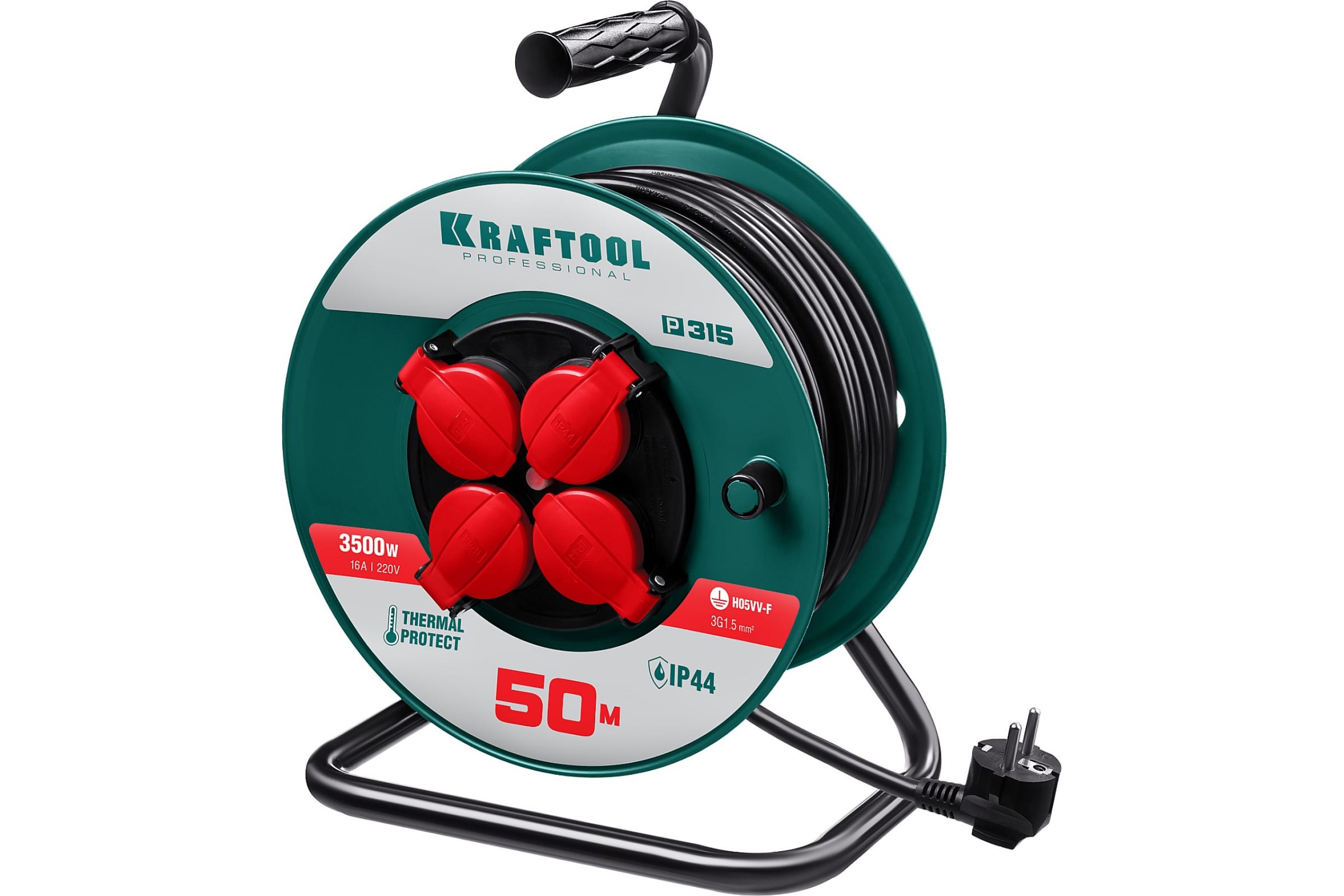 Удлинитель на катушке KRAFTOOL P-315, 50м, 3500Вт, 4 гнезда, IP44, ПВС 3х1.5мм2, 55084-50
