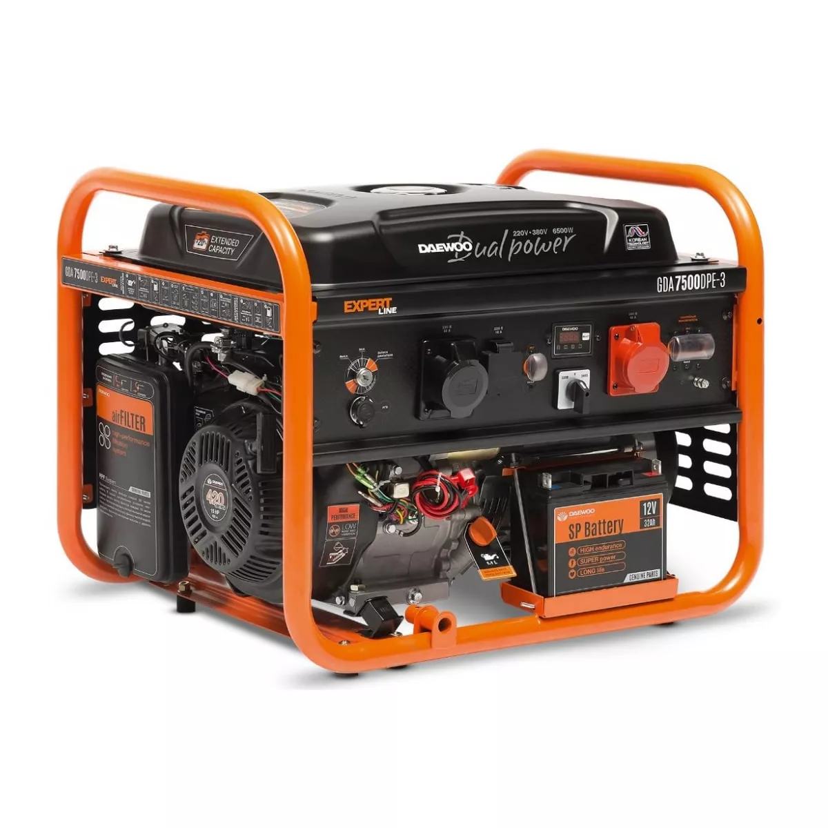 Бензиновый генератор DAEWOO GDA 7500DPE-3 отличается простотой управления. Медная обмотка альтернатора обеспечивает высокую отдачу мощности как для однофазного, так и для трехфазного тока, а также дает возможность работы до 18 часов при 50% нагрузки. Электронный блок автоматического контроля (AVR) гарантирует подачу качественного тока. Благодаря системе защиты от перегрузок вероятность короткого замыкания исключается. Бортовой аккумулятор и электрический стартер служат для комфортной эксплуатации, что особенно важно для начинающего пользователя. Многофункциональный дисплей предназначается для визуального контроля над основными рабочими параметрами (напряжение, частота тока). Разъем ATS позволяет подключить систему автономного управления агрегатом.