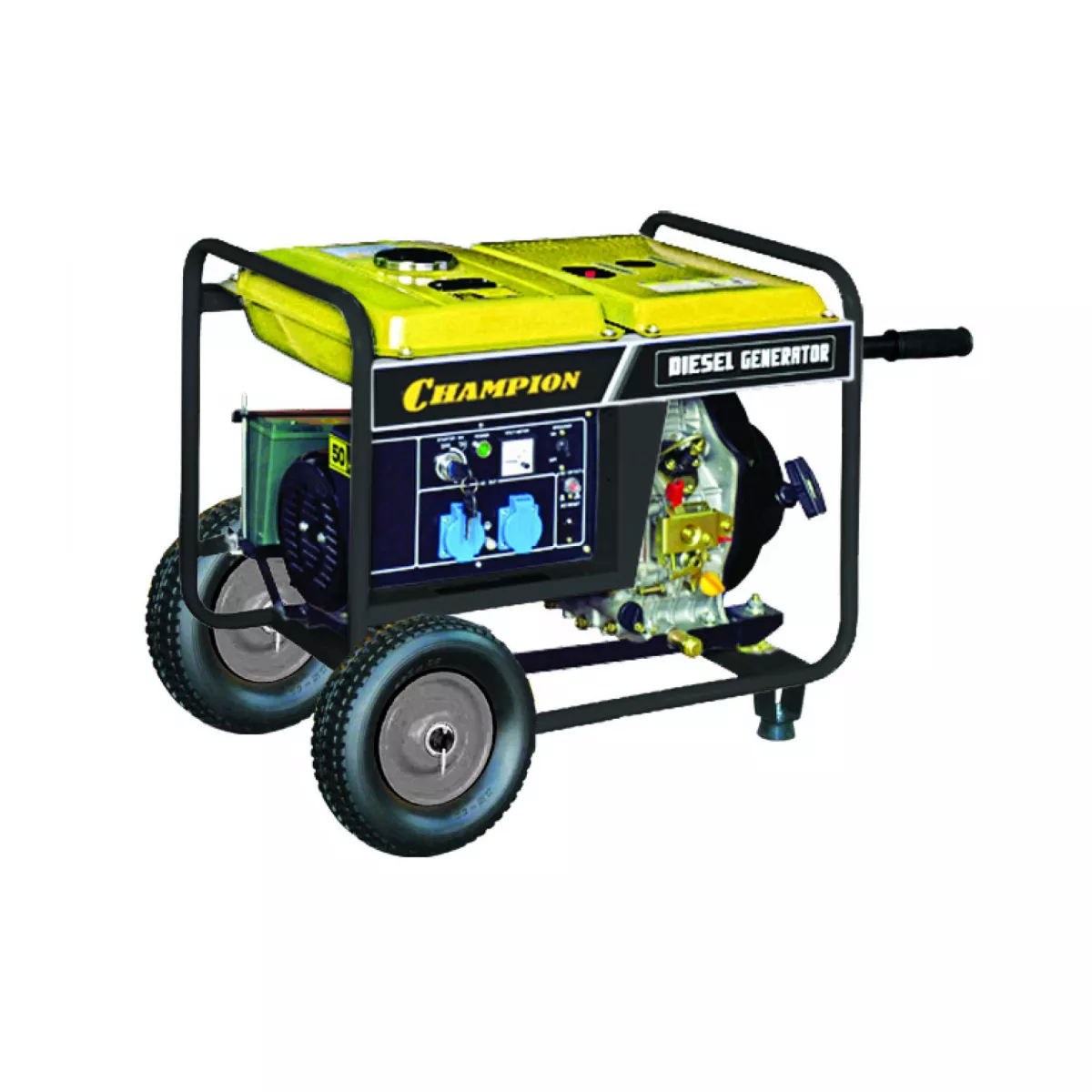 Дизельный генератор CHAMPION DG3600E оснащен колесами для удобной транспортировки. Используется как основной источник питания электрооборудования мощностью до 3 кВт. На одной заправке бака емкостью 11.5 литров генератор работает 8.5 часов непрерывно. Запуск генератора осуществляется с помощью электрического стартера.