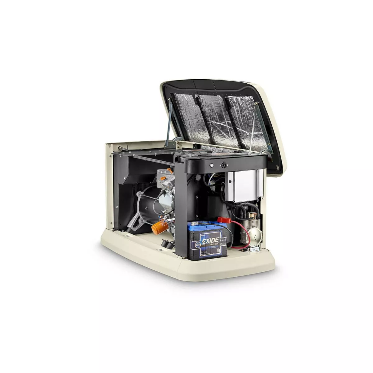 Кожух SAE. Всепогодный корпус с текстурированным эпоксидным покрытием защищает генератор от негативного воздействия осадков и обеспечивает тихую работу. Кожух SAE выдерживает резкие порывы ветра (до 240 км/ч). Для надежности панель крыши оснащена петлями с блокировкой.