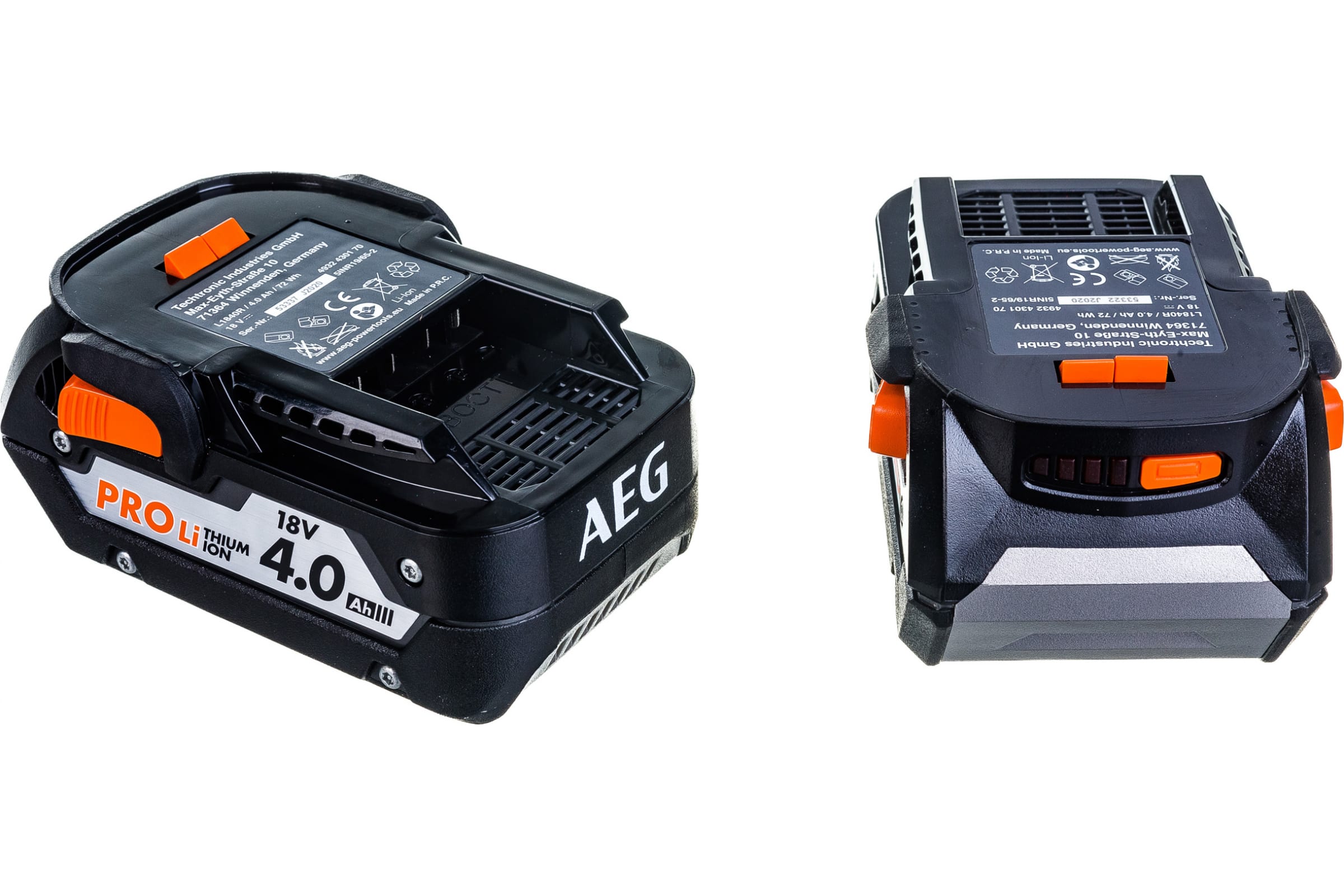 Набор SETLL1840BL AEG 4932464157 состоит из двух аккумуляторов L1840R Li-Ion, 18В, 4 Ач и зарядного устройства BL1218.