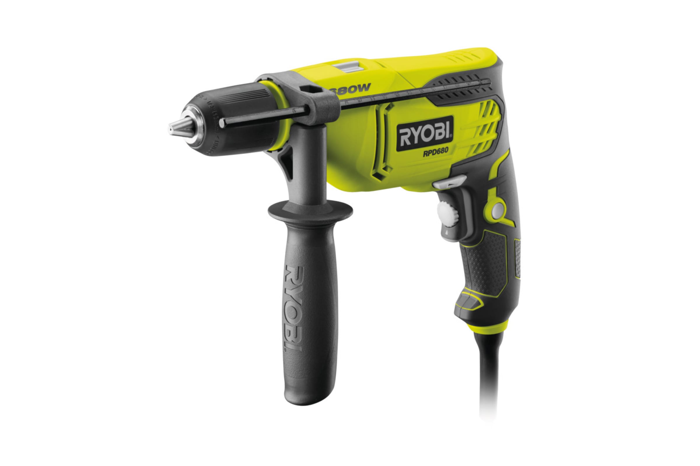 Ударная дрель Ryobi RPD680K 5133002016 служит для сверления отверстий в различных материалах и выполнения демонтажных работ.