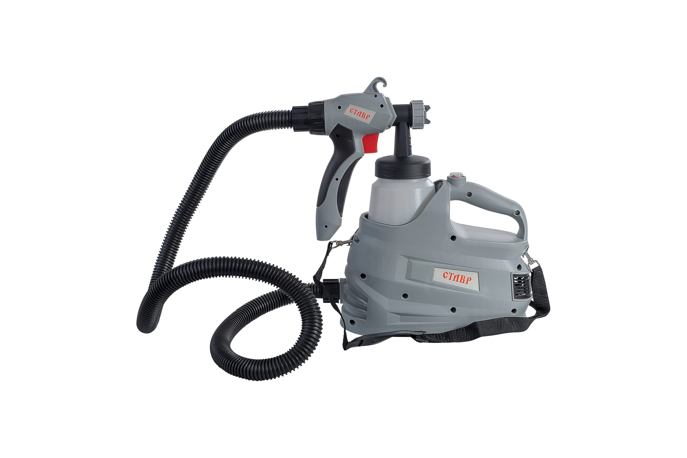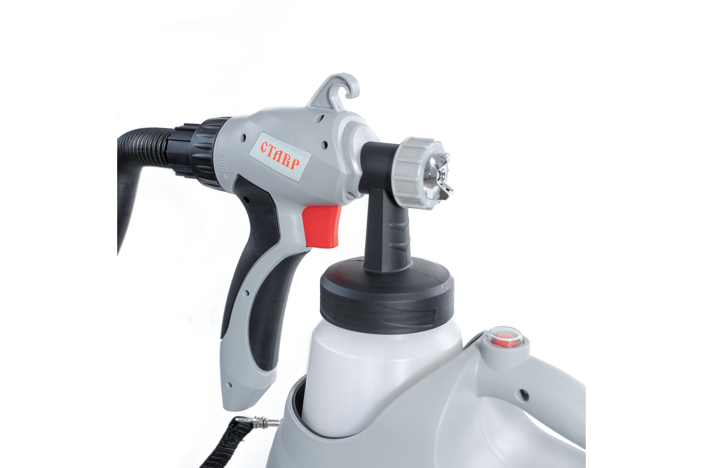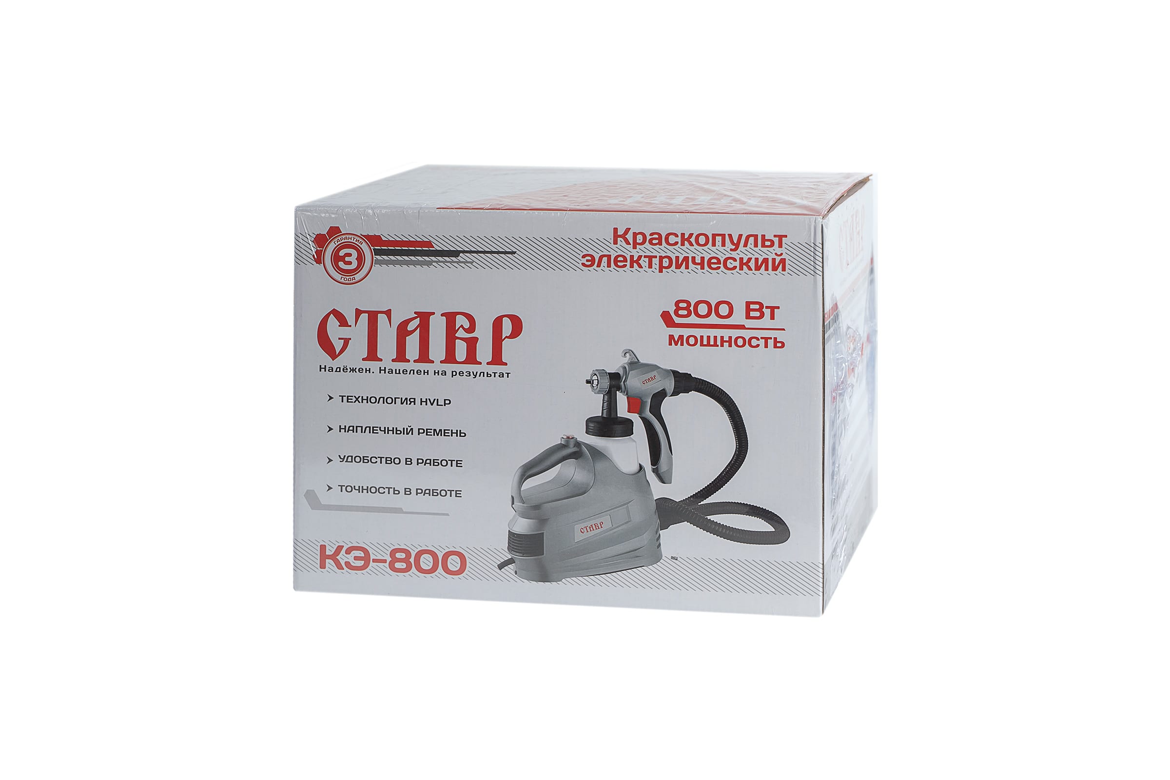 Электрический краскопульт Ставр КЭ-800 имеет нижнее расположение бачка, чтобы оператор мог лучше видеть обрабатываемую поверхность. Модель работает по технологии HVLP, что обеспечивает высококачественную покраску. Предусмотрена рукоятка для переноски устройства. Во время работы краскопульт можно подвесить на ремень, который идет в комплекте.
