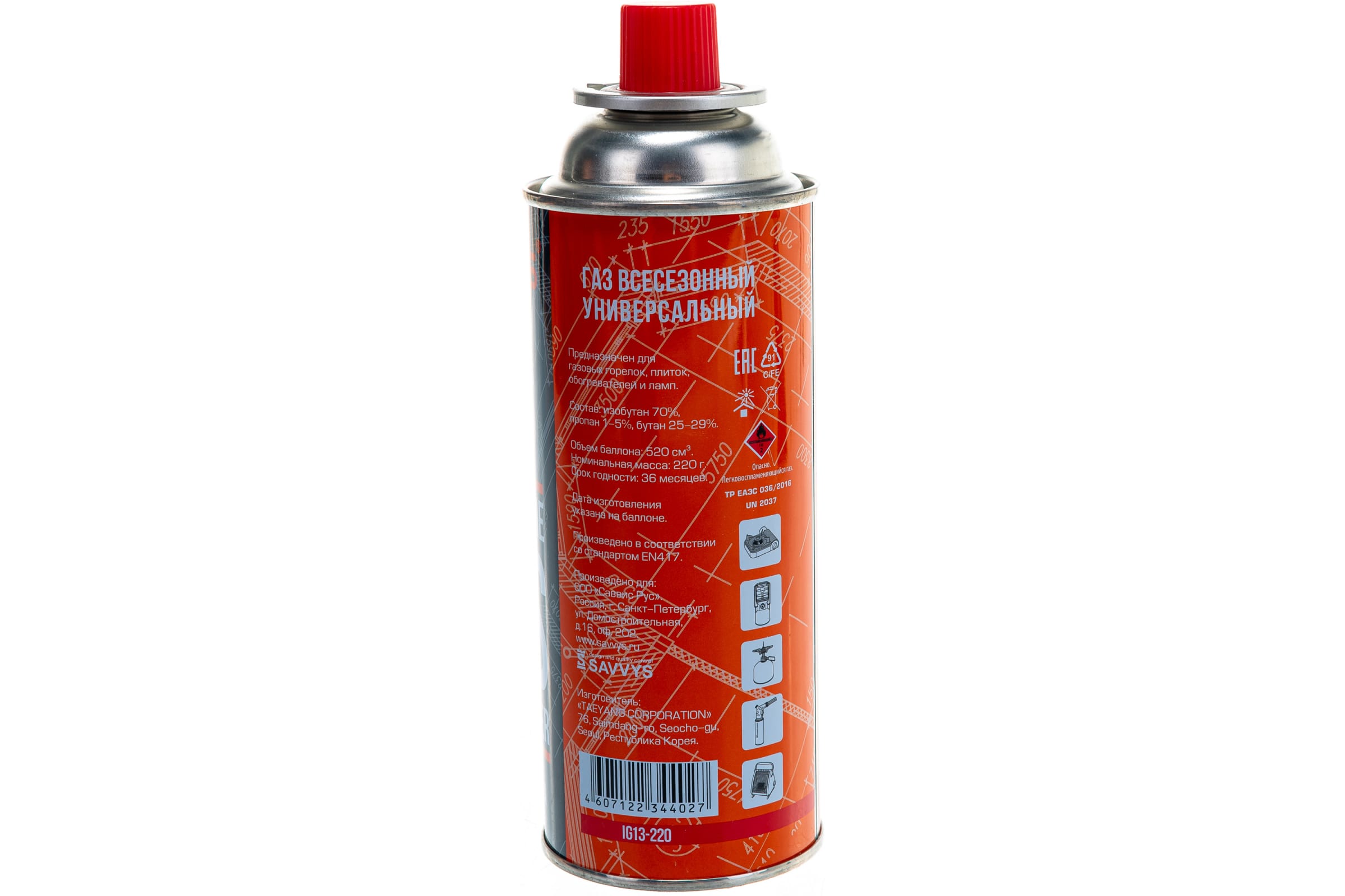 В состав газа входит изобутан 70%, бутан 25-29% и пропан 1-5%, что обеспечивает всесезонное использовани