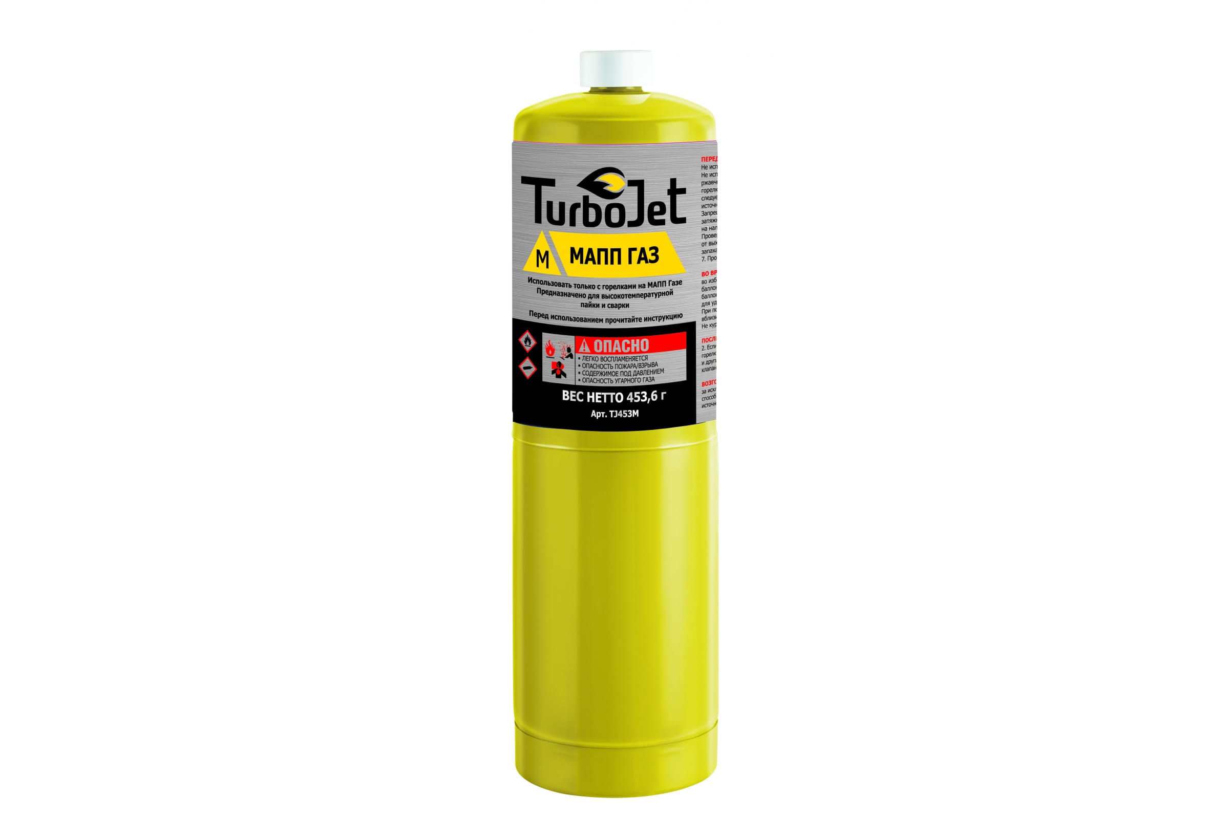 Газовый баллон Turbojet с МАПП газом TJ453M. МАПП-газ - смесь сжиженного нефтяного газа с метилацетилен-пропадиеном. Mapp-газ имеет высокую температуру сгорания, при которой можно резать, варить, паять. В процессе работы с горелками на МАПП-газе темпер