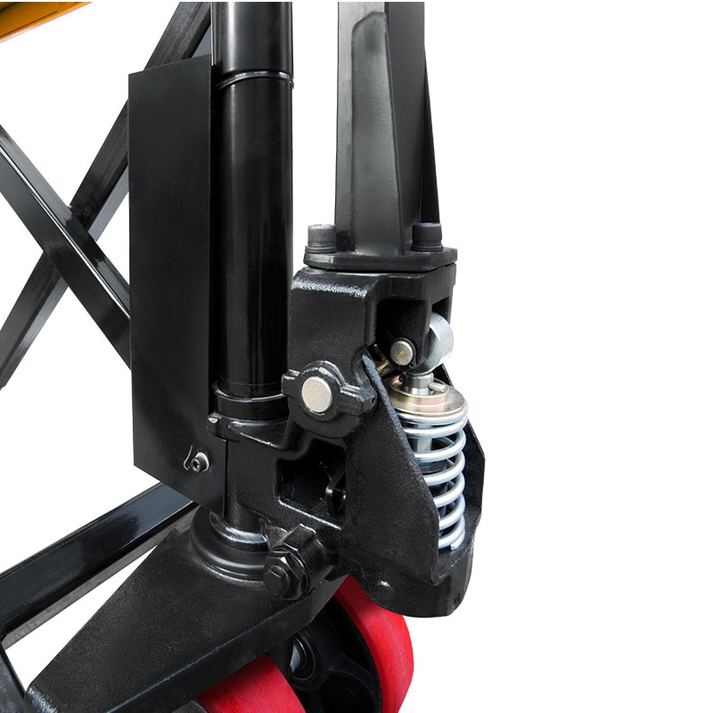 Благодаря телескопической конструкции гидроцилиндра снижены габариты и масса тележки, что значительно повышает удобство ее эксплуатации. Ручка со специальным покрытием делает управление тележкой комфортным в любое время года. При подъеме вил на высоту 400 мм на землю опускаются дополнительные опоры, препятствующие перемещению тележки и повышающие ее устойчивость.