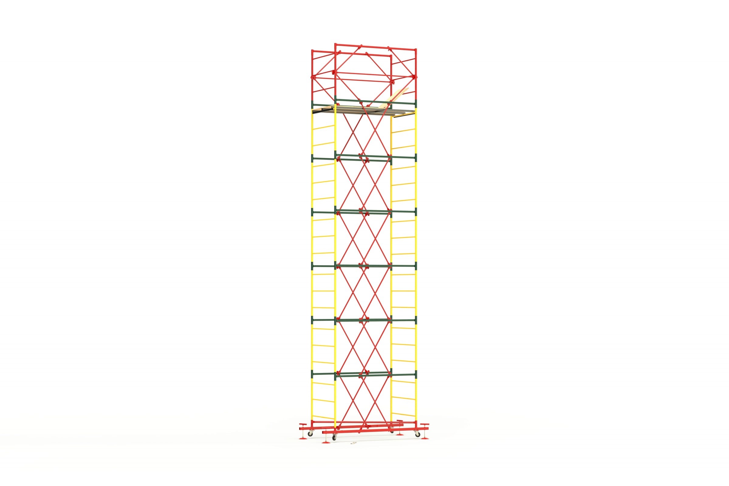 Защитное порошковое покрытие обладает хорошей устойчивостью к возникновению коррозии и неблагоприятным атмосферным воздействиям. Транспортировочные колеса облегчают перемещение вышки внутри рабочей зоны.