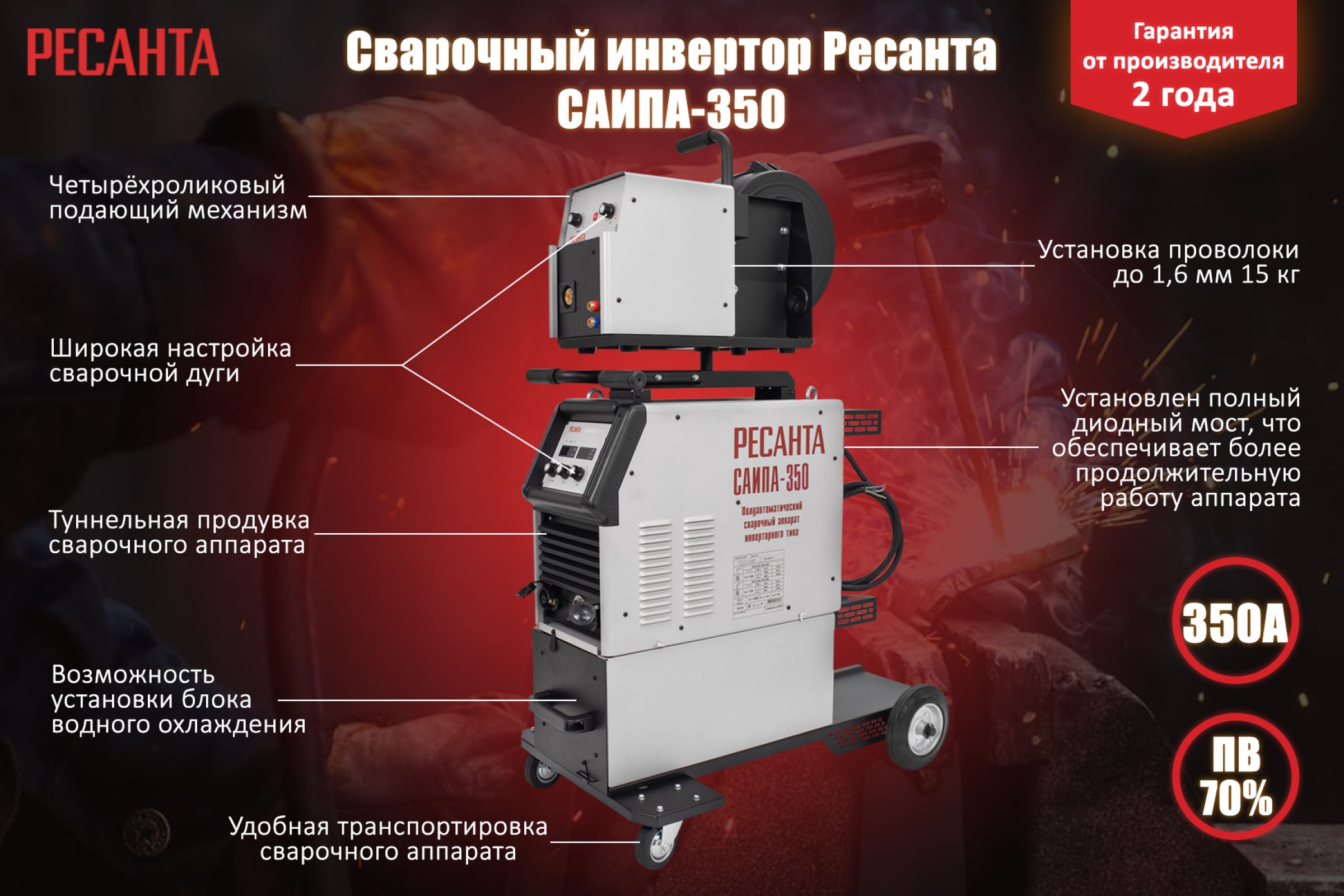 Сварочный полуавтомат Ресанта САИПА-350 /MIG/MAG/ 65/67 предназначен для осуществления полуавтоматической сварки постоянным током проволокой в среде инертного (режим MIG) или активного (режим MAG) защитного газа. Применяется для соединения деталей и ко