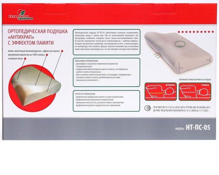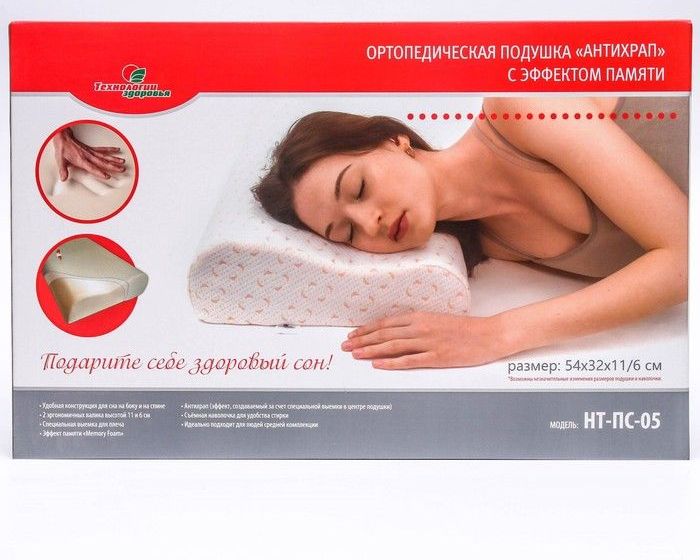 Подушка ортопедическая НТ-ПС-05 "Антихрап", для взрослых, с эффектом памяти и выемкой под плечо, 54x32 см, валики 11/6 см