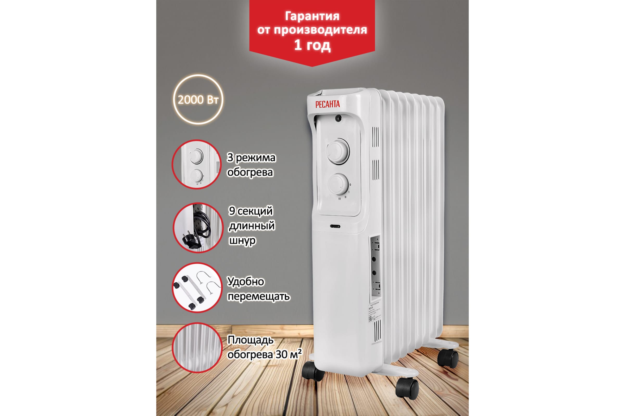 Масляный радиатор Ресанта ОМ-9А 2 кВт 67/3/16