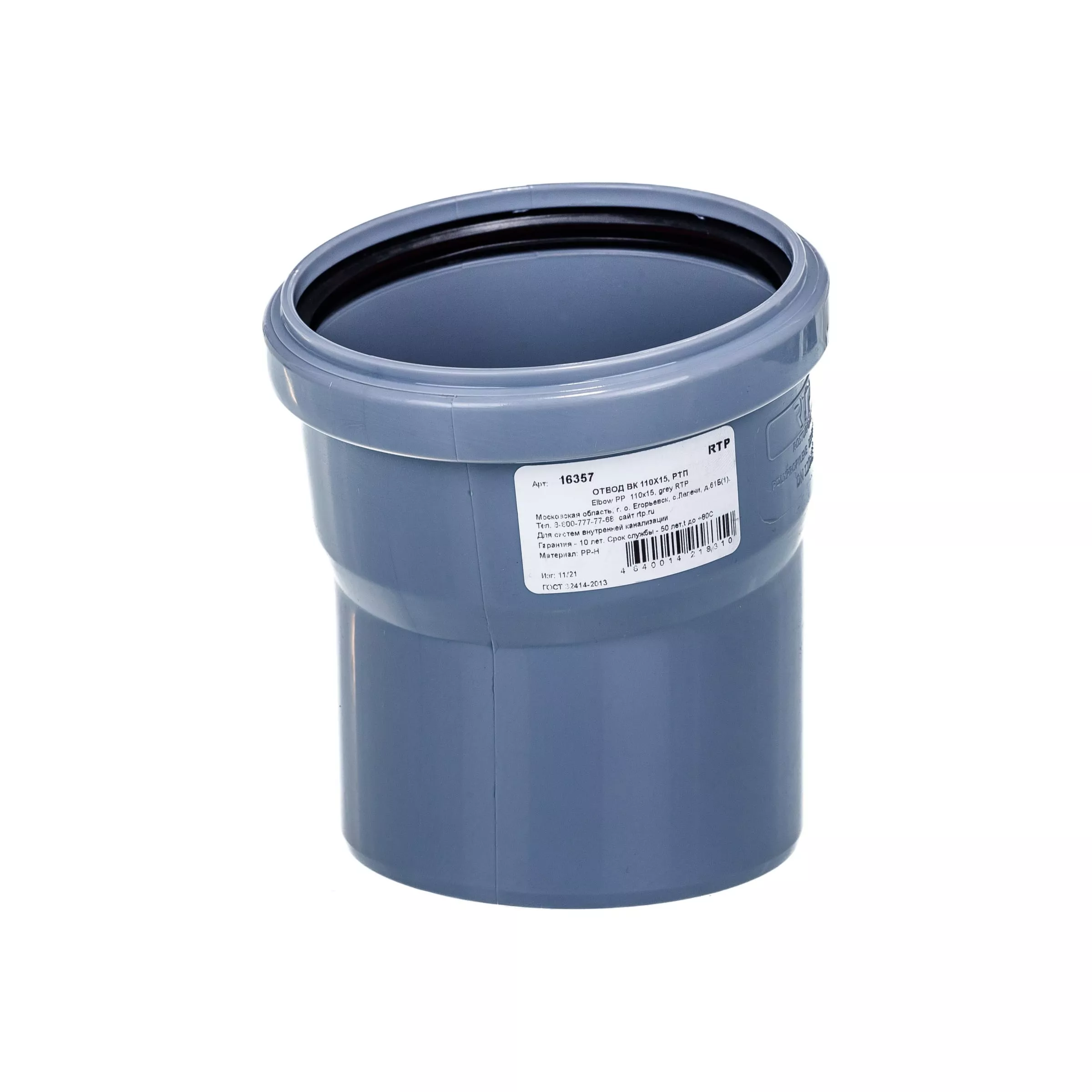 Канализационный отвод RTP 110 мм, 15 градусов, серый 16357