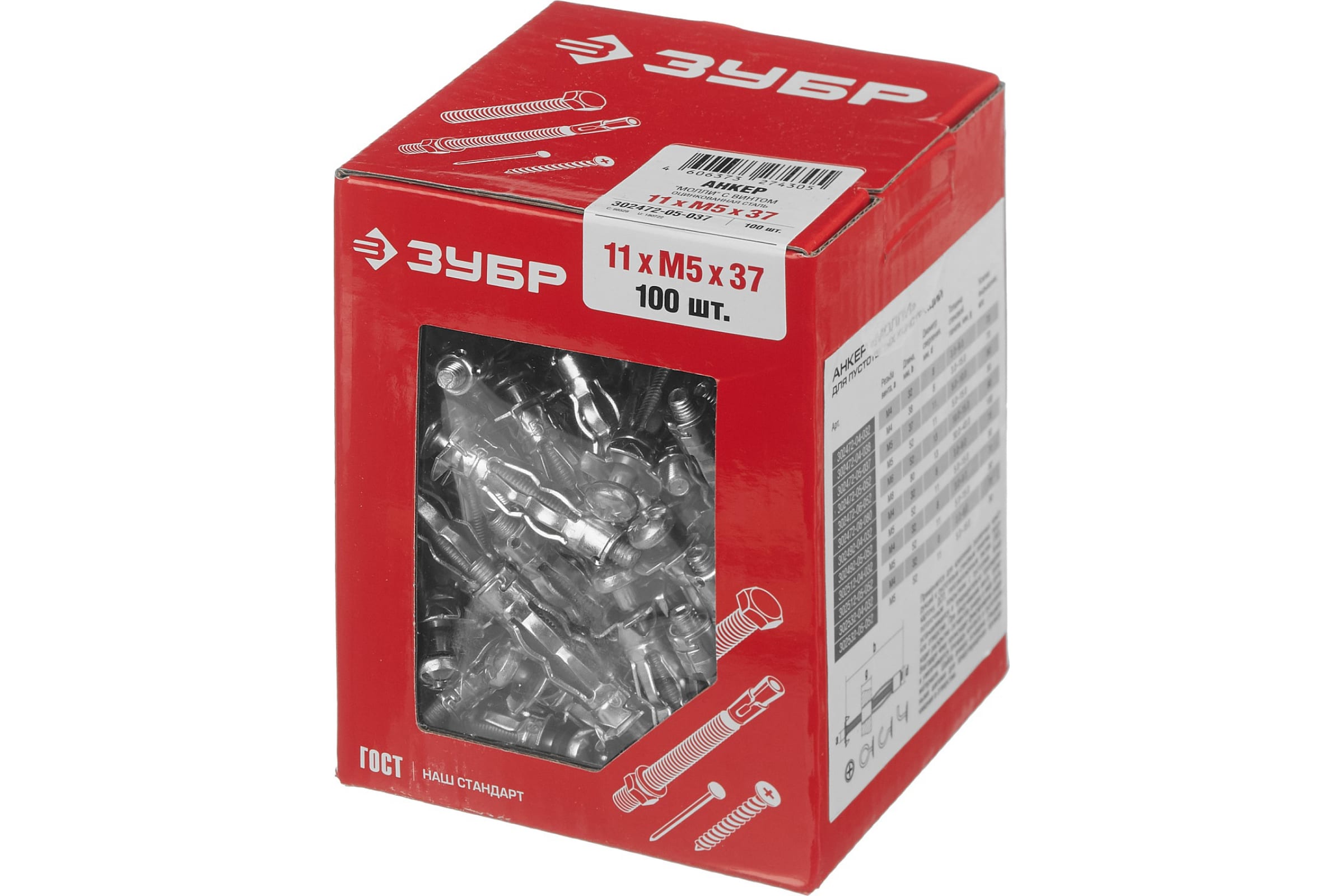 Анкер для пустотелых материалов Зубр МОЛЛИ, 11 мм x M5 x 37 мм, 100 шт, оцинкованный 302472-05-037