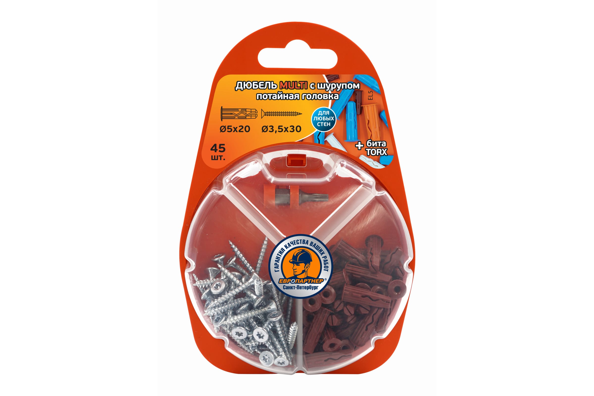 Дюбель ЕВРОПАРТНЕР MULTI plug 5x20 + шуруп MULTI универсальный, пот. головка, ZN, 3,5x30 + бита TX, 45 шт. RB2 0126 применяется при креплении изделий в любое основание: бетон, пенобетон, газобетон, полнотелый и пустотелый кирпич, природный камень, гипс