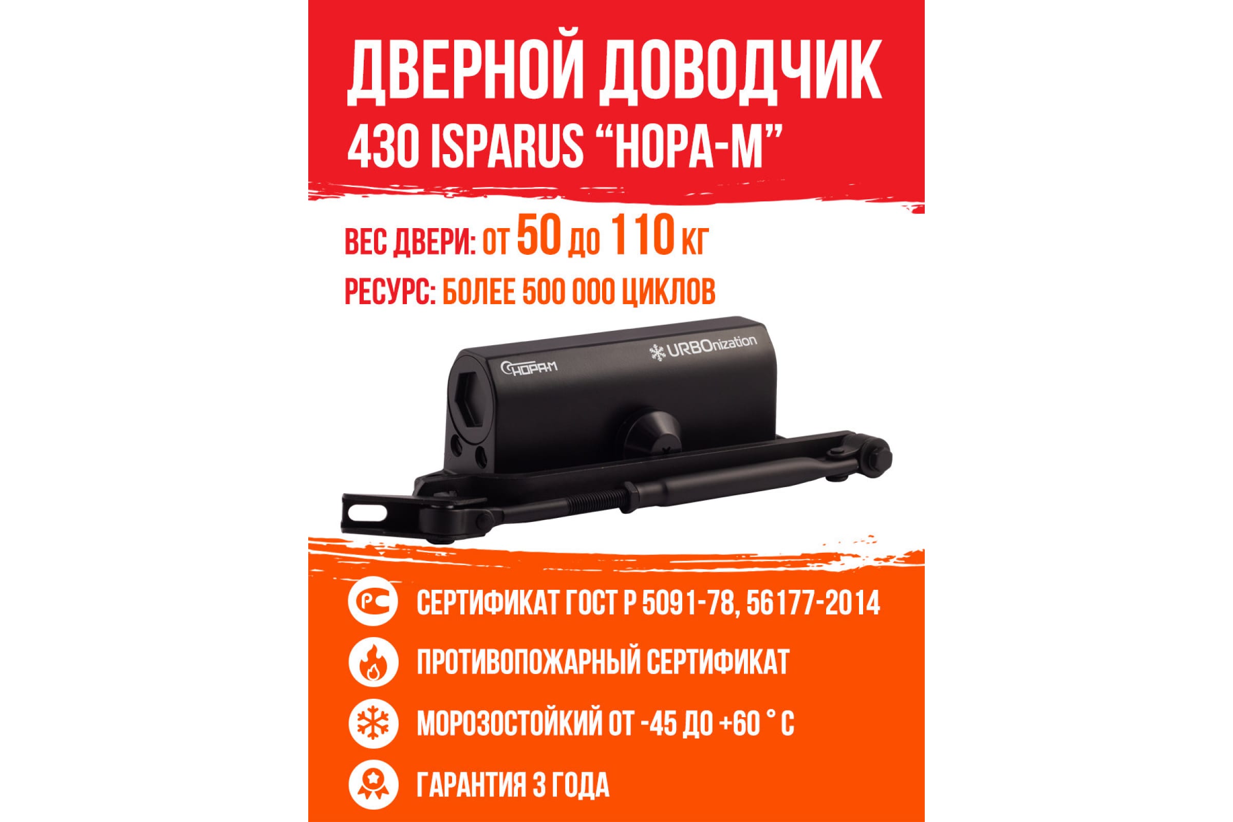Дверной доводчик ISPARUS 430 морозостойкий, для дверей от 50 до 110 кг, черный 17195