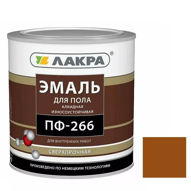 Эмаль для пола Лакра ПФ-266 желто-коричневая - высококачественная эмаль на основе алкидного лака. Обладает хорошими декоративными свойствами, укрывистостью и прочным сцеплением с окрашиваемой поверхностью. Легко наносится, образуя однородное гладкое покрытие, устойчивое к истиранию.