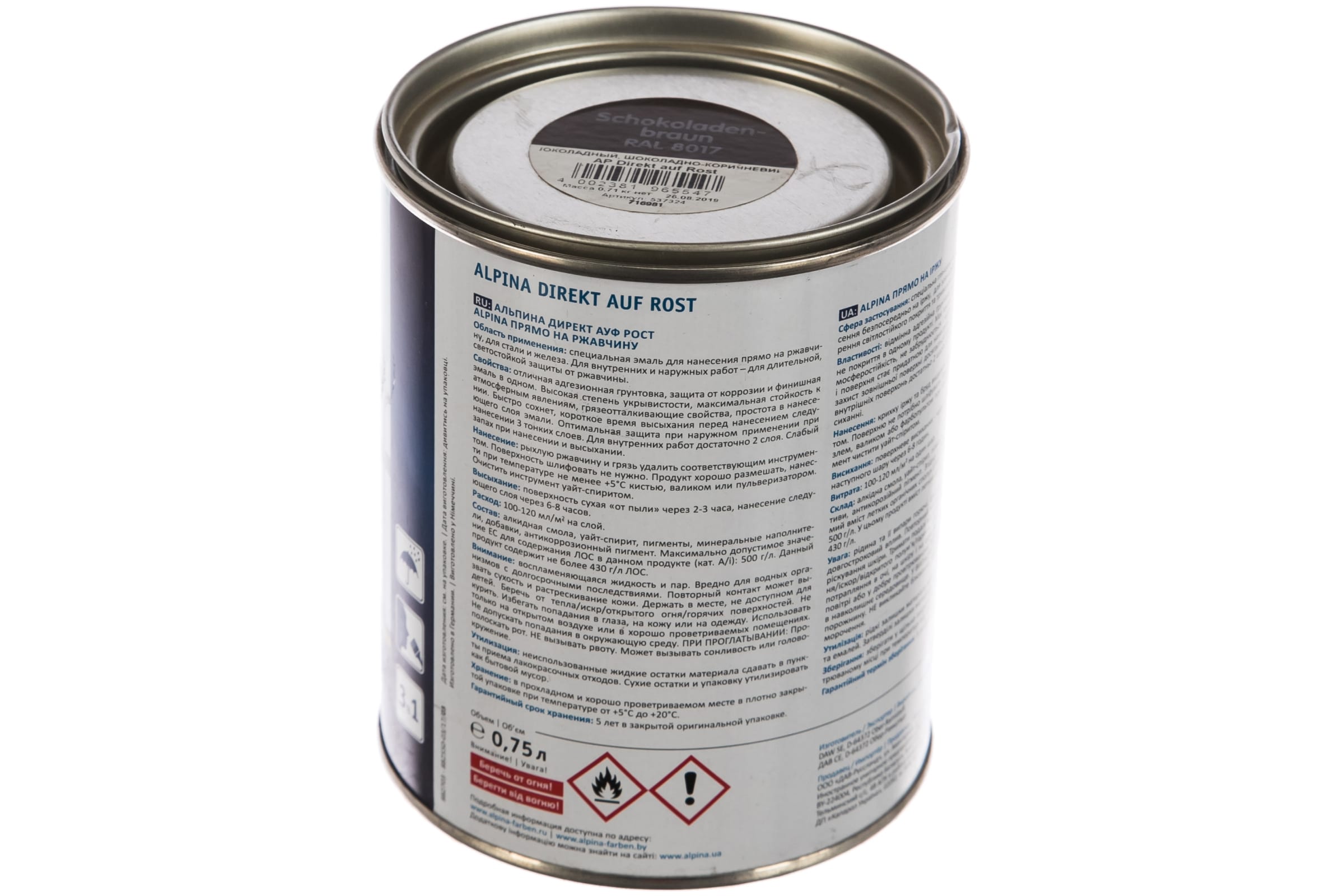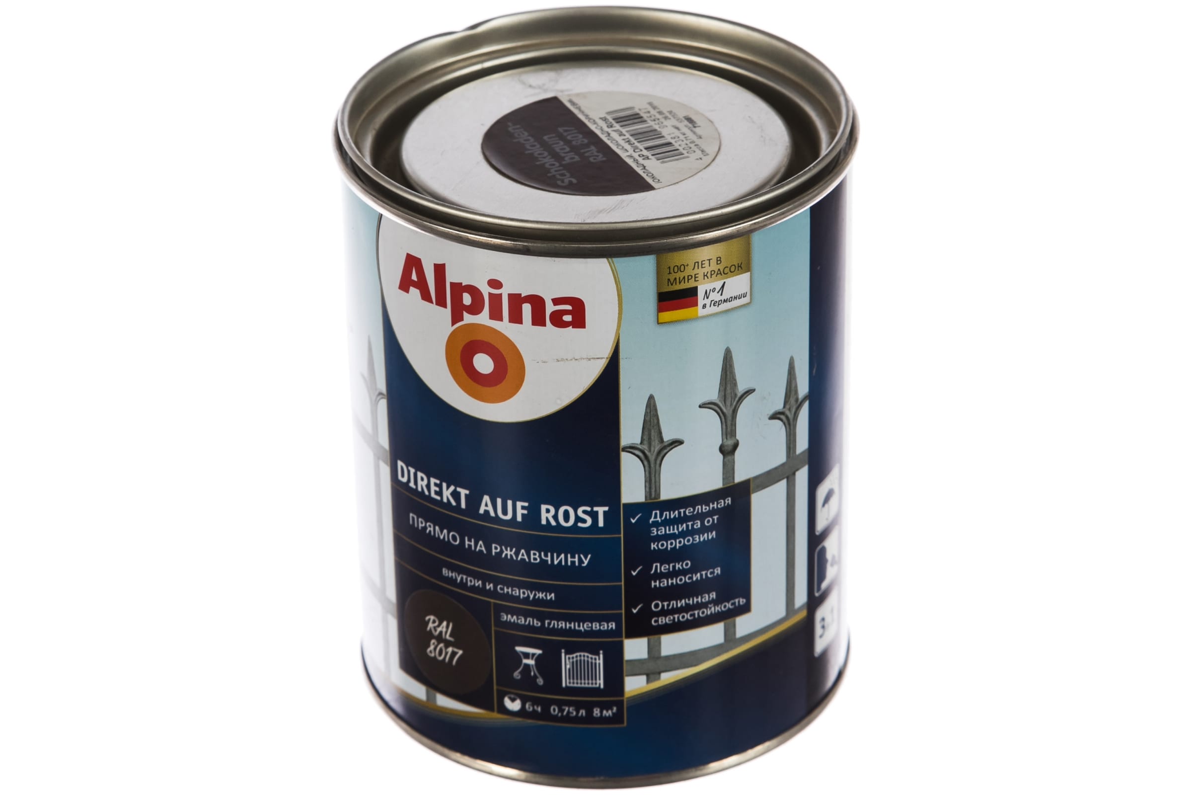 Эмаль ALPINA NEW DIREKT AUF ROST гладкая по ржавчине 8017, шоколадно-коричневый, nussbraun 0,75л 537324