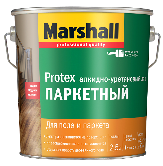 Лак Marshall Protex - алкидно-уретановый полуматовый паркетный лак. Обработанная лаком поверхность обладает хорошей износостойкостью, обеспечивая покрытию устойчивость к абразивному износу, ударам и царапинам. Лак удобен в применении, легко разравнивается, не оставляет следов от инструмента, придавая лакируемой поверхности хороший декоративный вид. Обладает экономичным расходом.