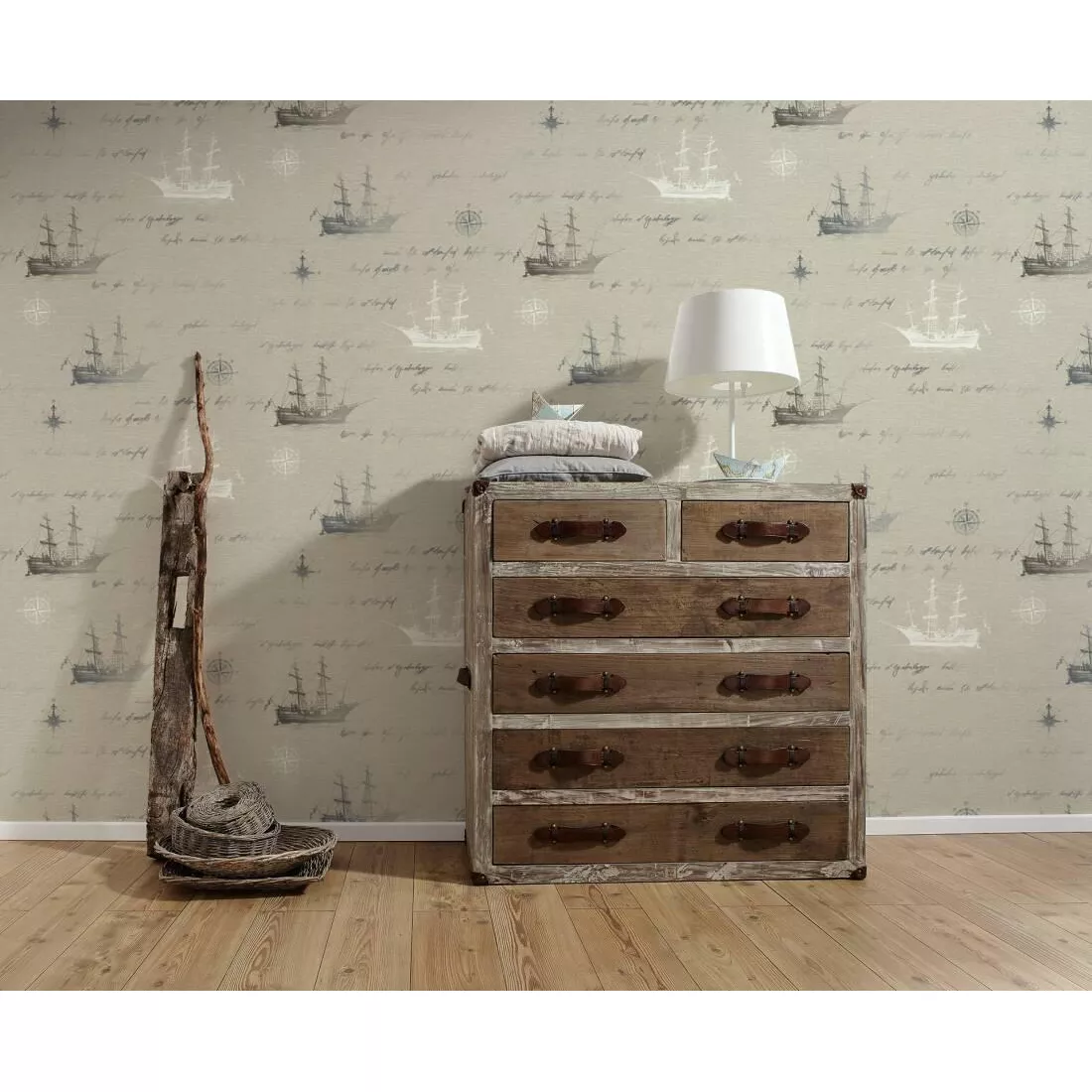 Морскую тему точно оценят любители водной стихии. Лучше всего такая тематика сочетается с обычной деревянной мебелью, уютными текстильными аксессуарами и хорошим уровнем освещения. Однотонные варианты стилизованы под холст. Их можно смело использовать не только в интерьере спален, кабинетов и гостиных, но и в детских комнатах для мальчиков, особенно если они любят море и путешествия.