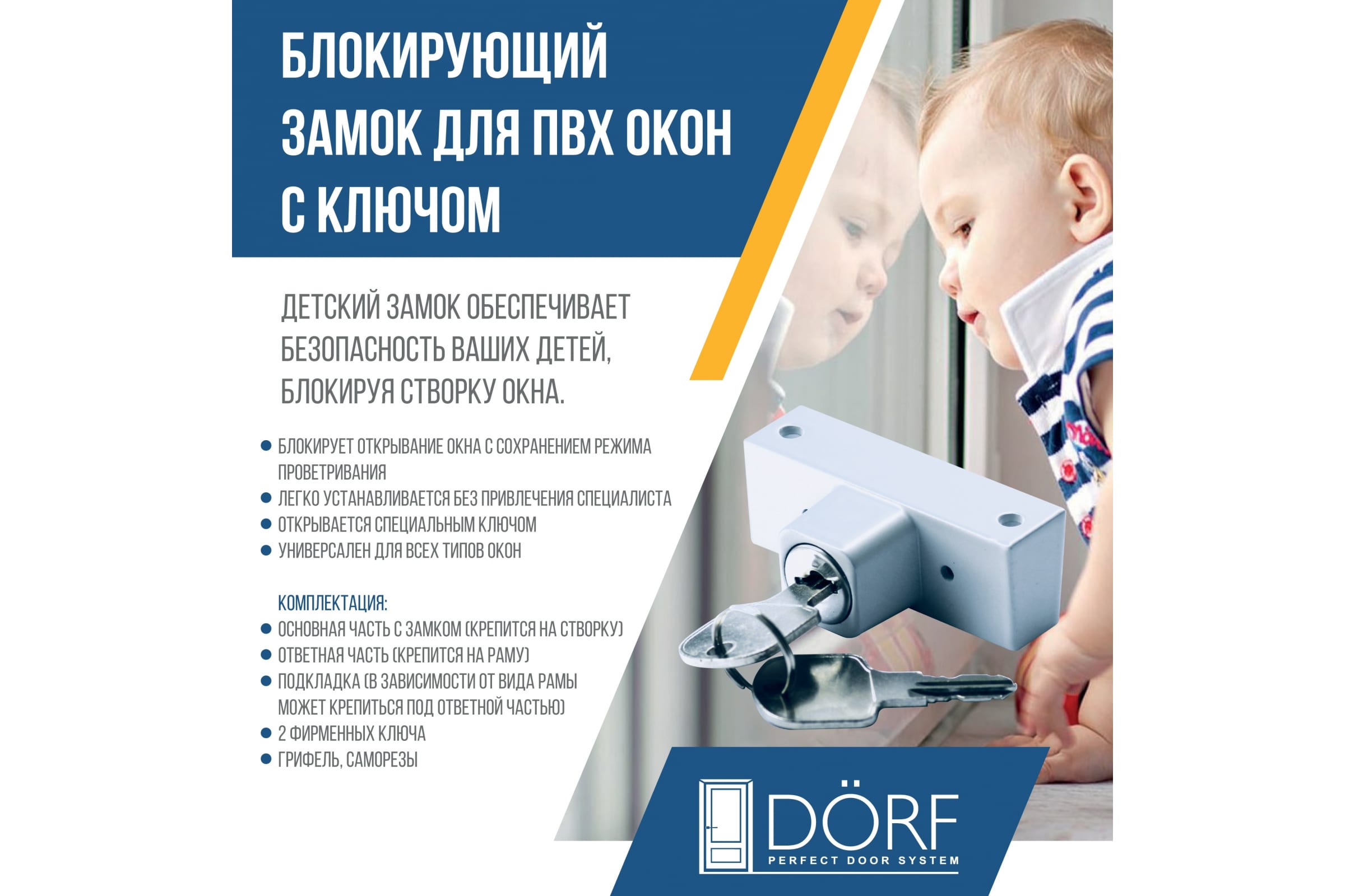 Блокирующий замок для ПВХ окон DORF с ключом 2 ключа, белый WBL-01_White
